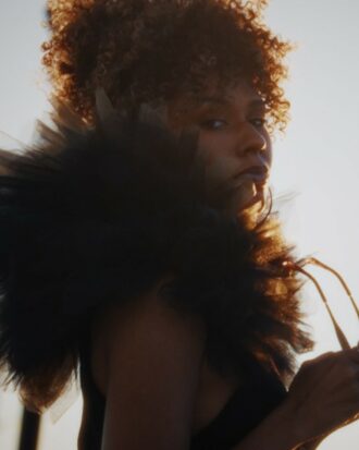 Le col impérial prune velours impose une allure couture. Sa couleur profonde enveloppe la silhouette d’une aura envoûtante, tandis que son