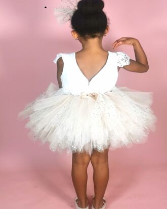 Le Tutu Beige Pailleté. La taille est réglable par un ruban satin glissé délicatement dans la ceinture du tutu. Matière