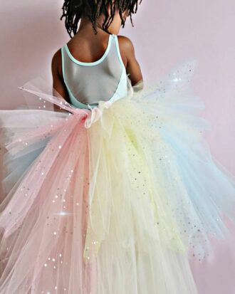 Un Tutu Enfant couleur Arc en ciel pastel. La taille est réglable par un ruban satin glissé délicatement dans la