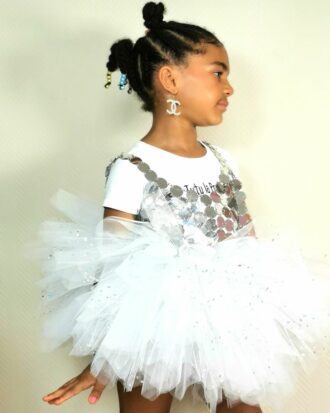 Le Tutu Blanc Pailleté. La taille est réglable par un ruban satin glissé délicatement dans la ceinture du tutu. Matière