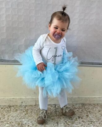 Un Tutu Enfant couleur Bleu Pastel. La taille est réglable par un ruban satin glissé délicatement dans la ceinture du