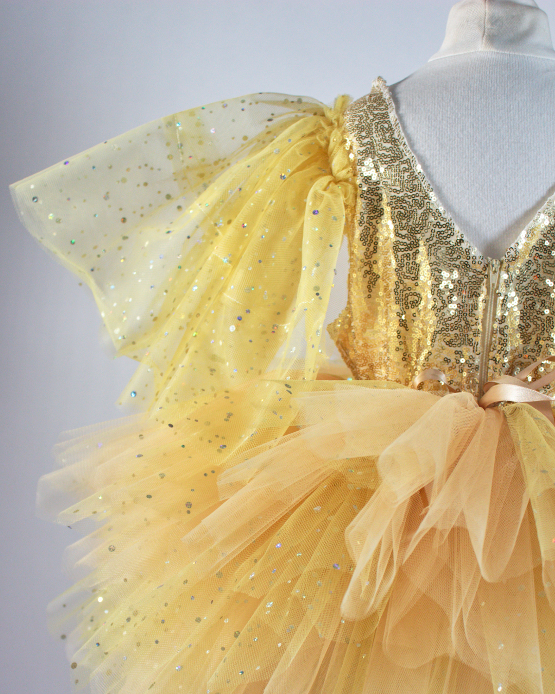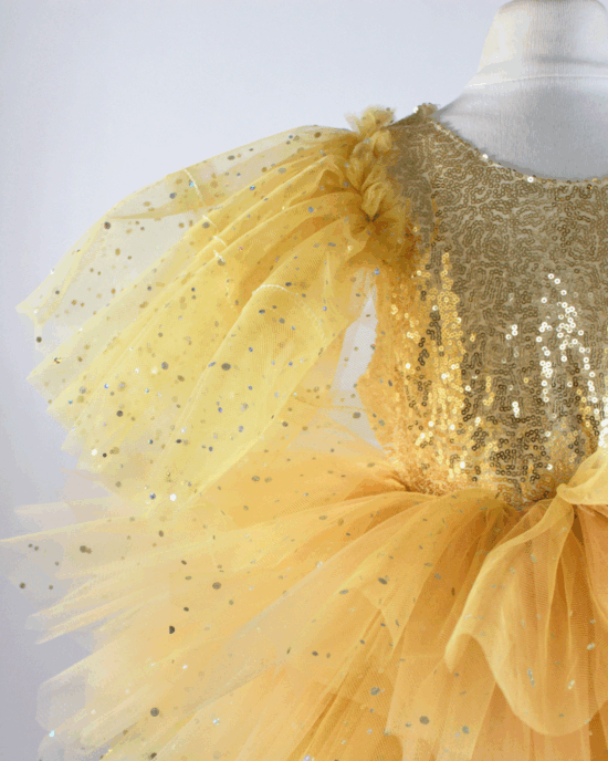 Ses sequins dorés captent la lumière à chaque mouvement, créant un effet scintillant qui transforme n’importe quel ensemble en tenue de cérémonie.