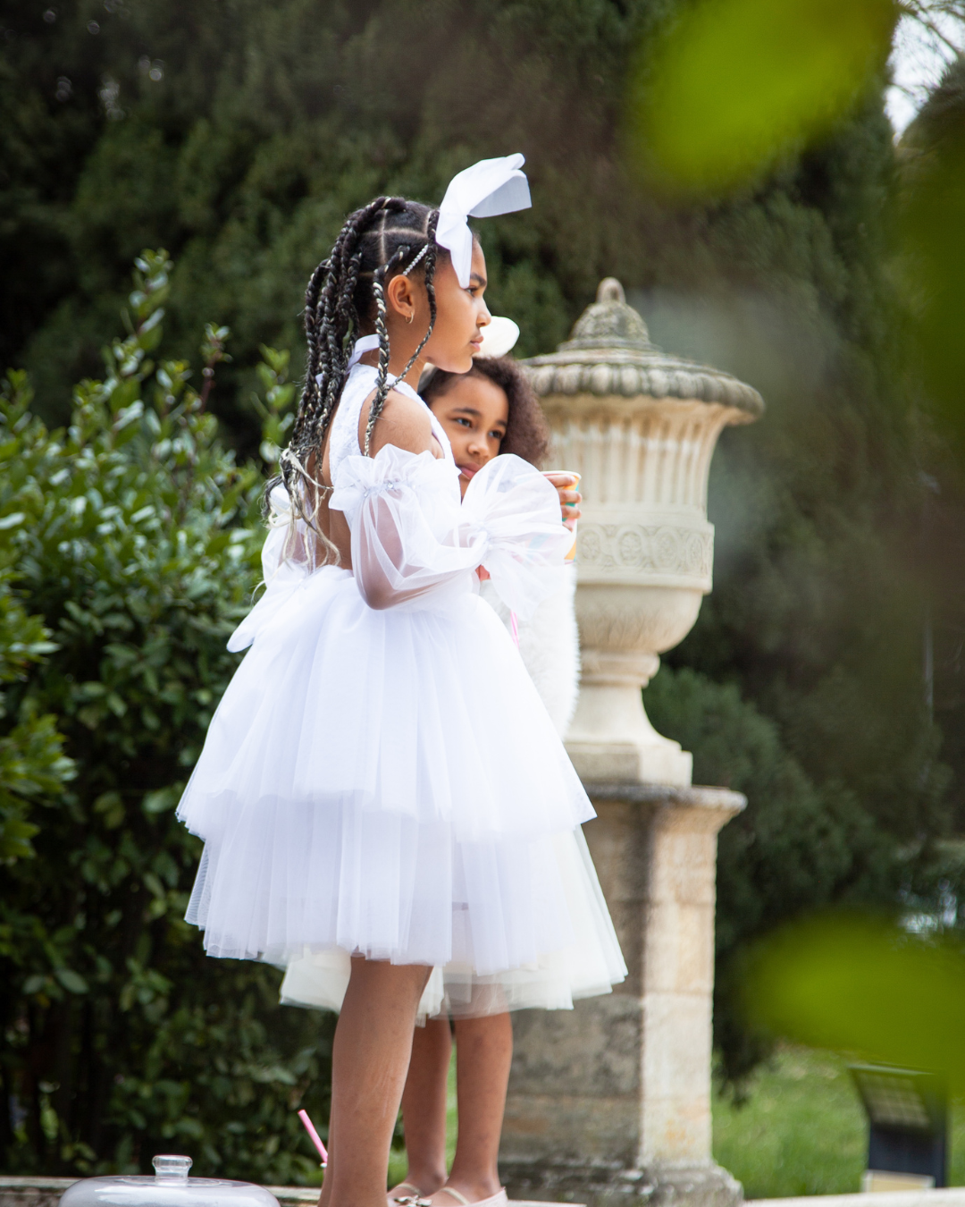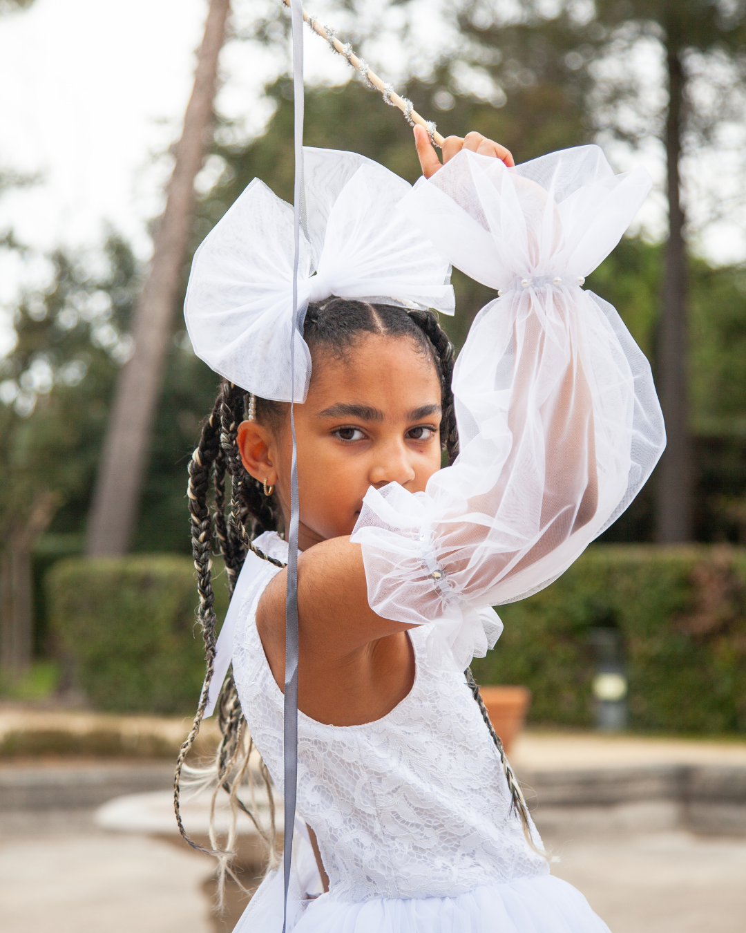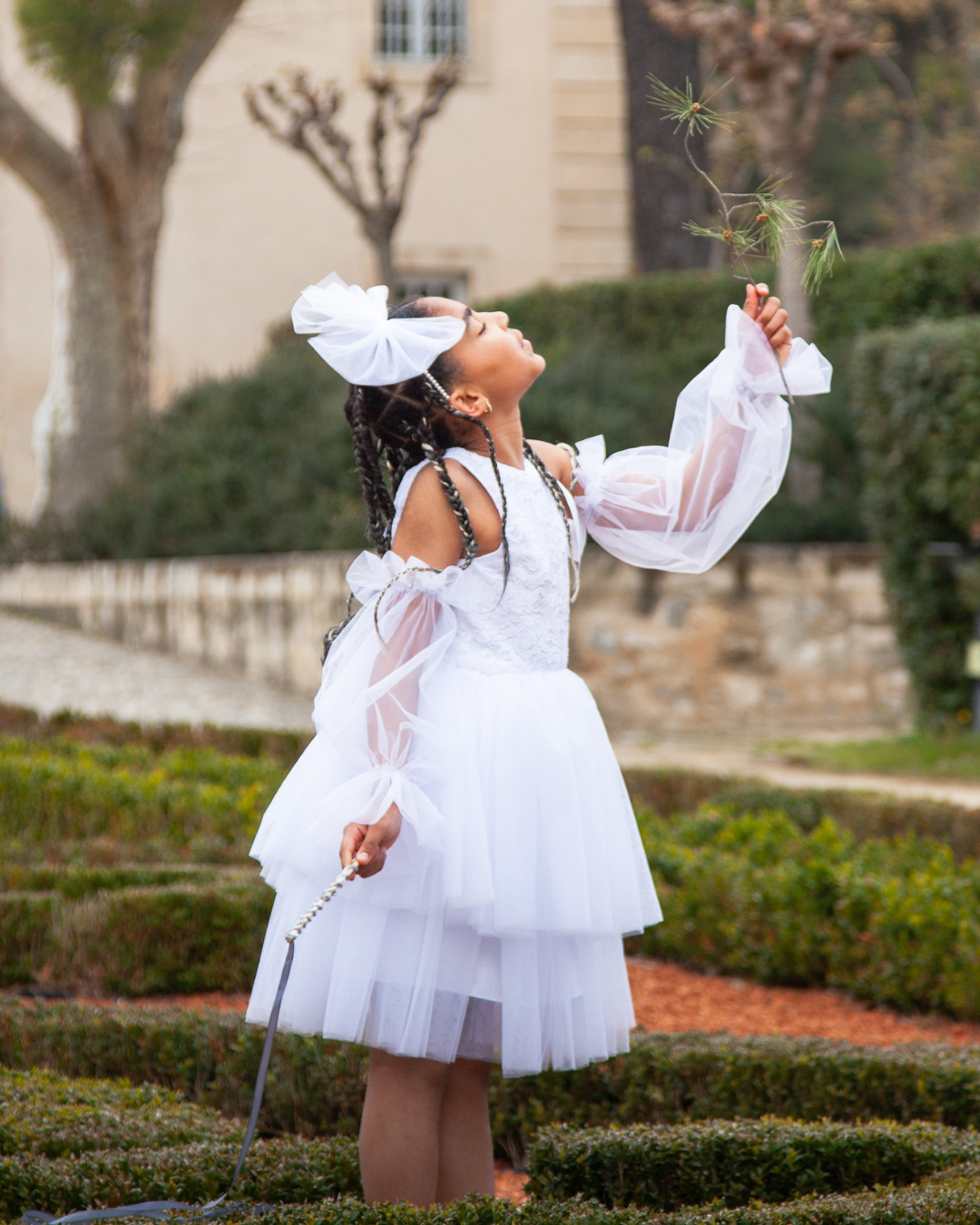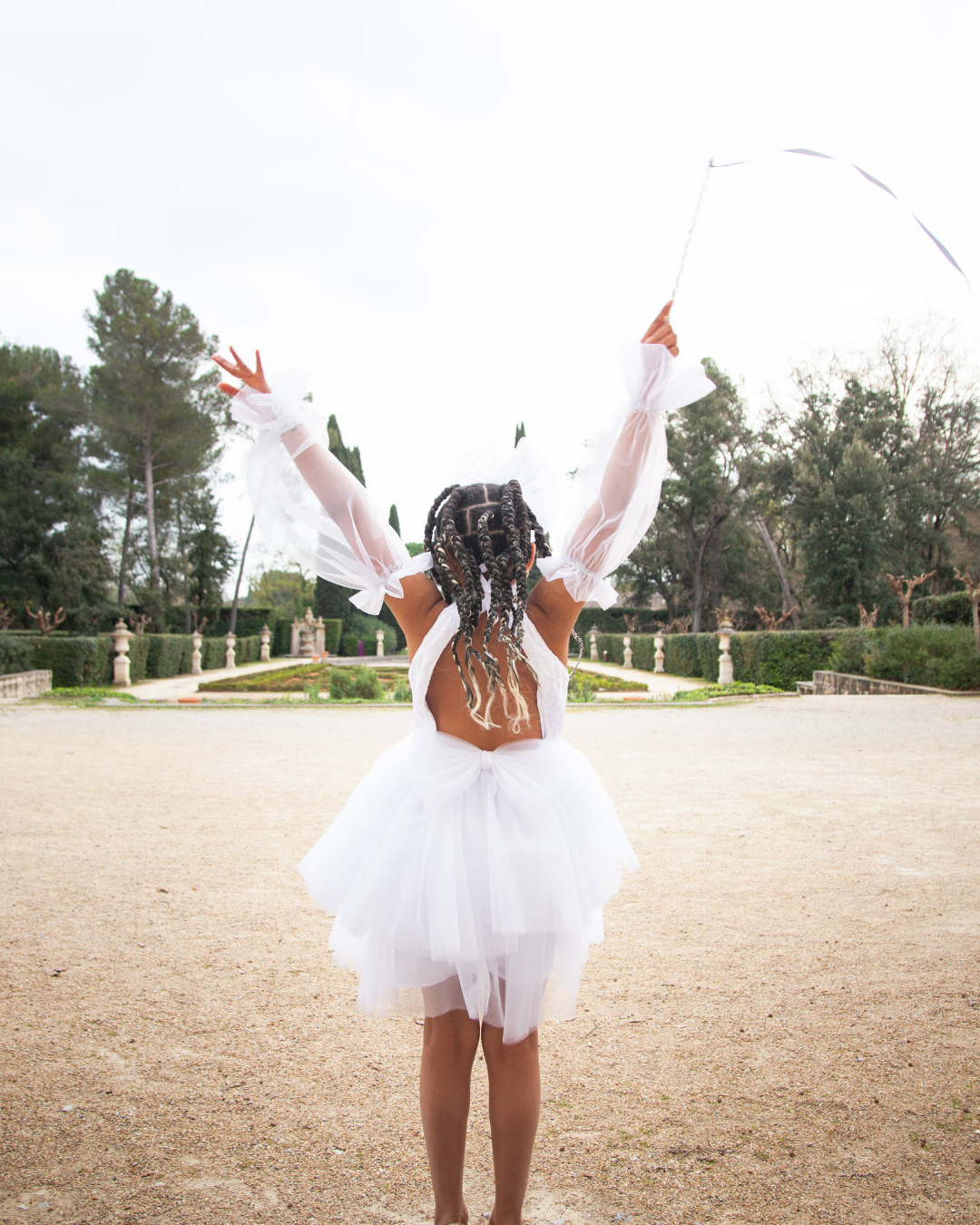 Son dos nu structuré met en lumière la délicatesse du geste, tandis que le volume du tulle crée un mouvement aérien et élégant.