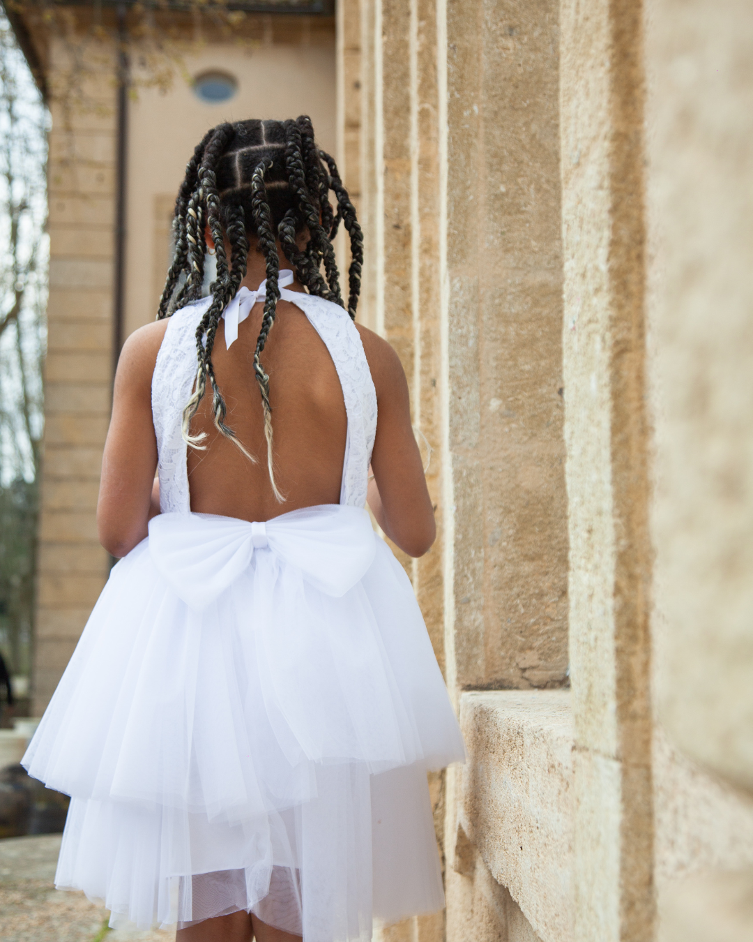 Au dos, un grand nœud en tulle vient signer la pièce avec caractère, renforçant son identité visuelle forte.