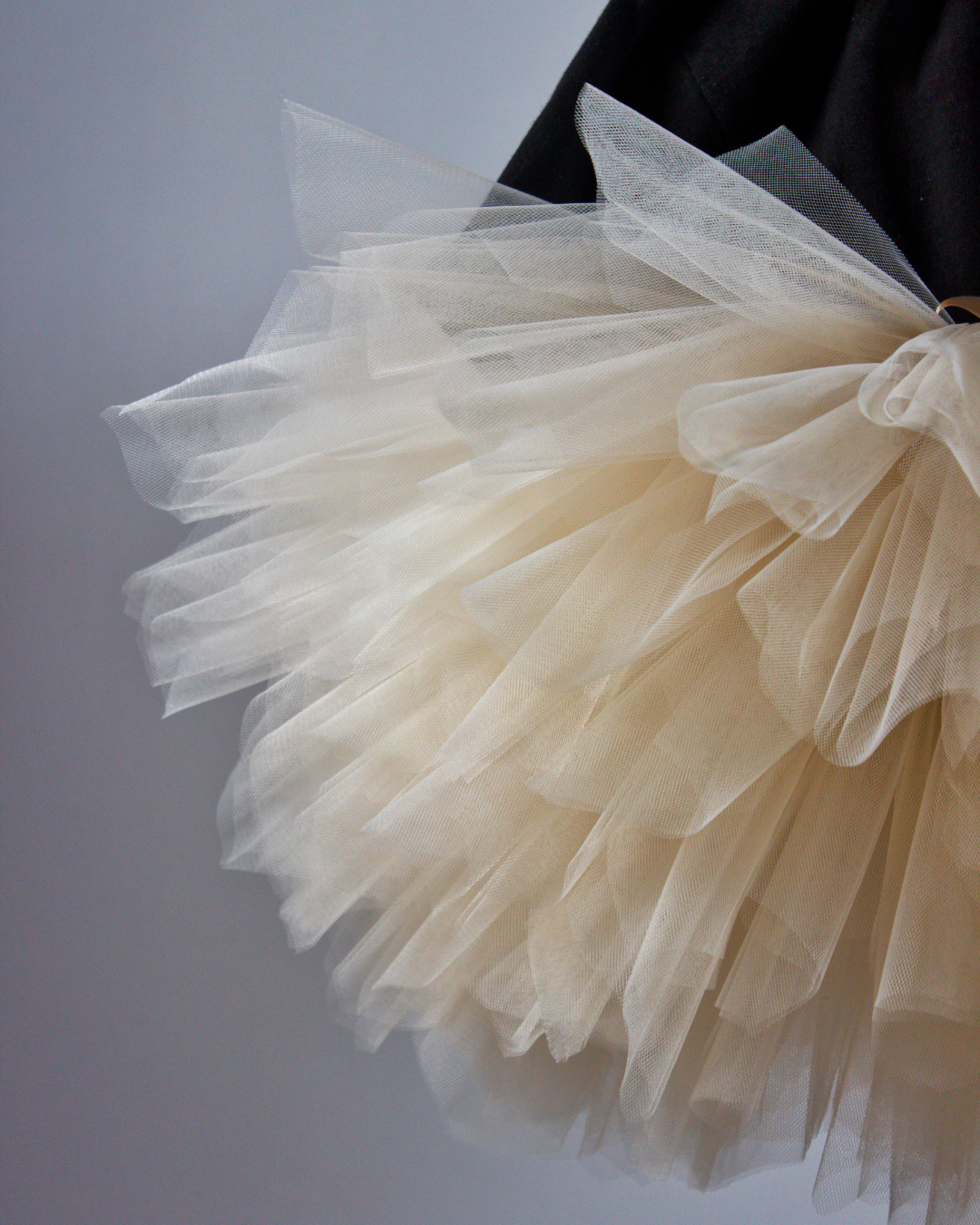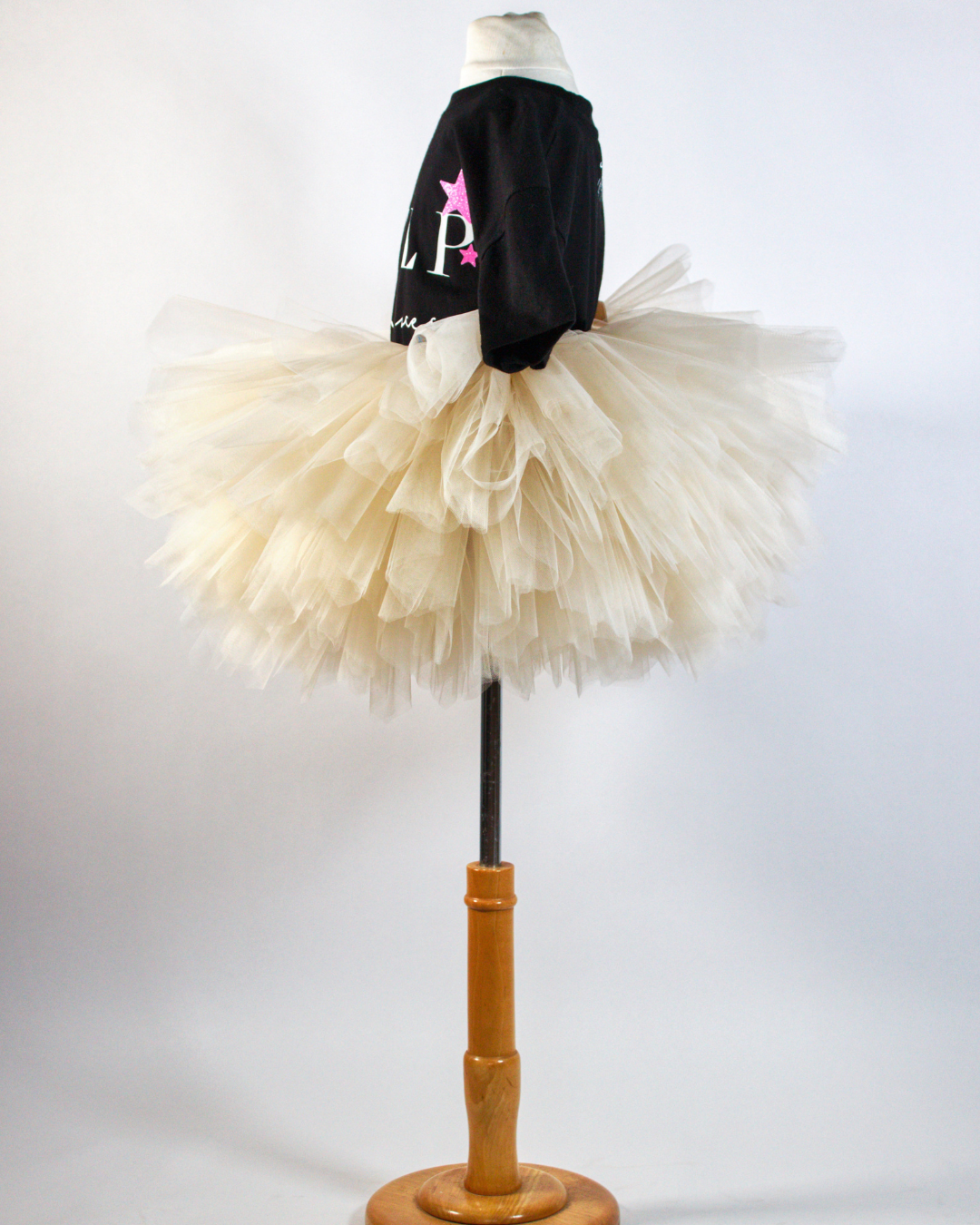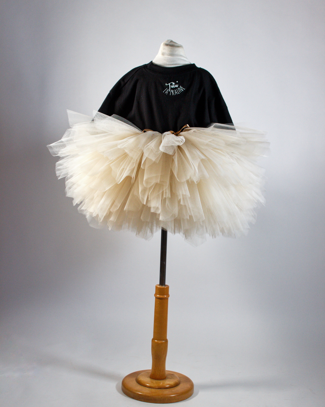 Confectionné à la main dans l’atelier Tutu La Praline, ce tutu offre un volume généreux, aérien, construit couche après couche pour créer cet effet nuage signature qui fait la renommée de la maison.