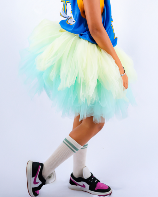 Ce tutu court JAUNE ZESTE & VERT D’EAU incarne l’énergie de l’enfance libre, le mouvement et la joie pure.
