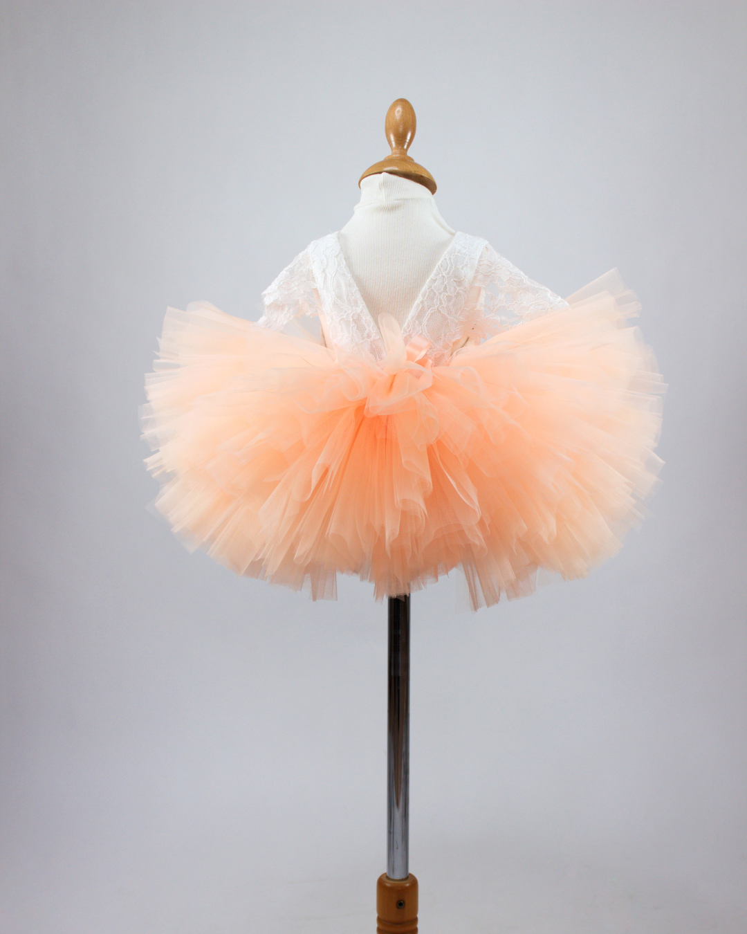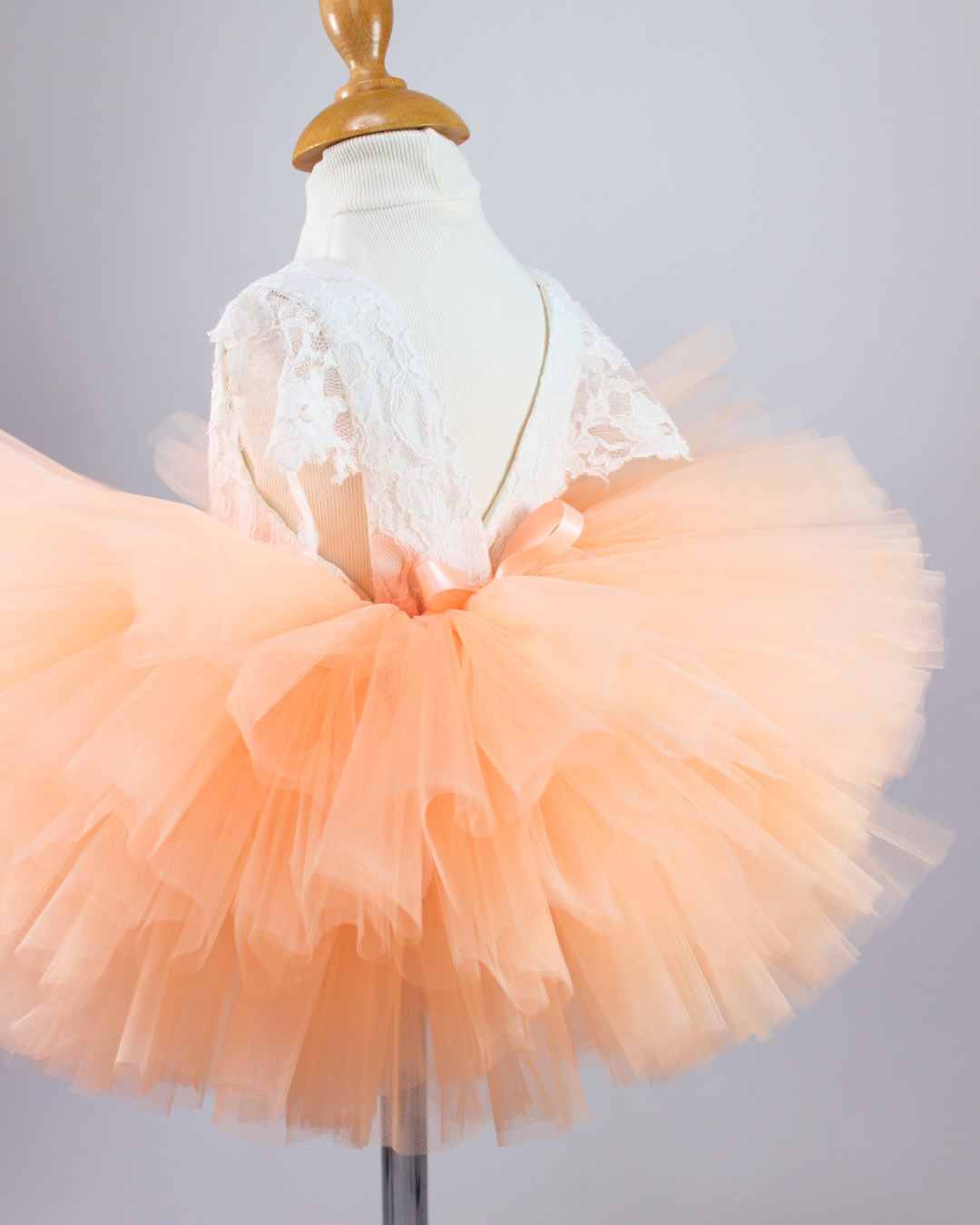 Confectionné à la main dans l’atelier Tutu la Praline, il se distingue par ses couches généreuses de tulle aérien dans un orange pastel délicatement fruité.