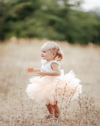 Un tutu court lumineux en orange pastel, généreux et aérien, confectionné à la main pour sublimer les moments précieux. Volume signature,